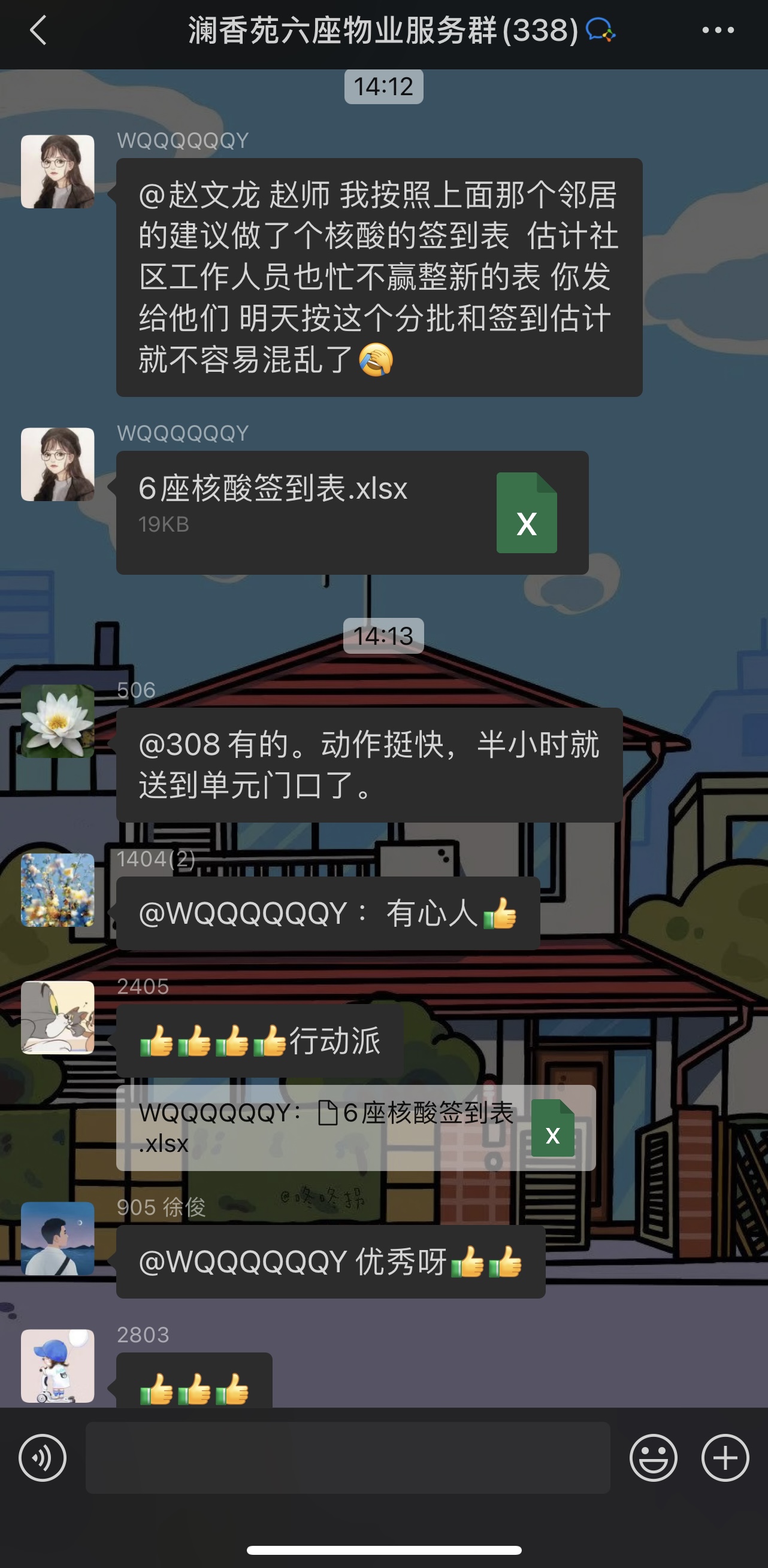 临近中午,一份名为“6座核酸签到表”的excel文件出现在社区群中,“我按照邻居的建议做了核酸签到表,社区工作人员肯定忙不赢做新的,明天大家按这个表格分批签到就很方便了。”网名WQQQQQQY的居民在群内说道。