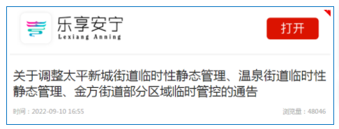 2022年9月9日晚,在临时性静态管理期间,发现1名与确诊病例关联的集中隔离管控人员核酸检测初筛阳性(详见《关于安宁市新增1例核酸检测初筛阳性人员活动轨迹的通告》)。经专家组研判,决定将温泉街道原暂定为3天的临时性静态管理时间调整为5天,即9月7日24时至9月12日24时止,期间共进行5次全员核酸检测,并继续严格执行临时性静态管理防控要求。后续根据疫情情况动态调整管控措施。