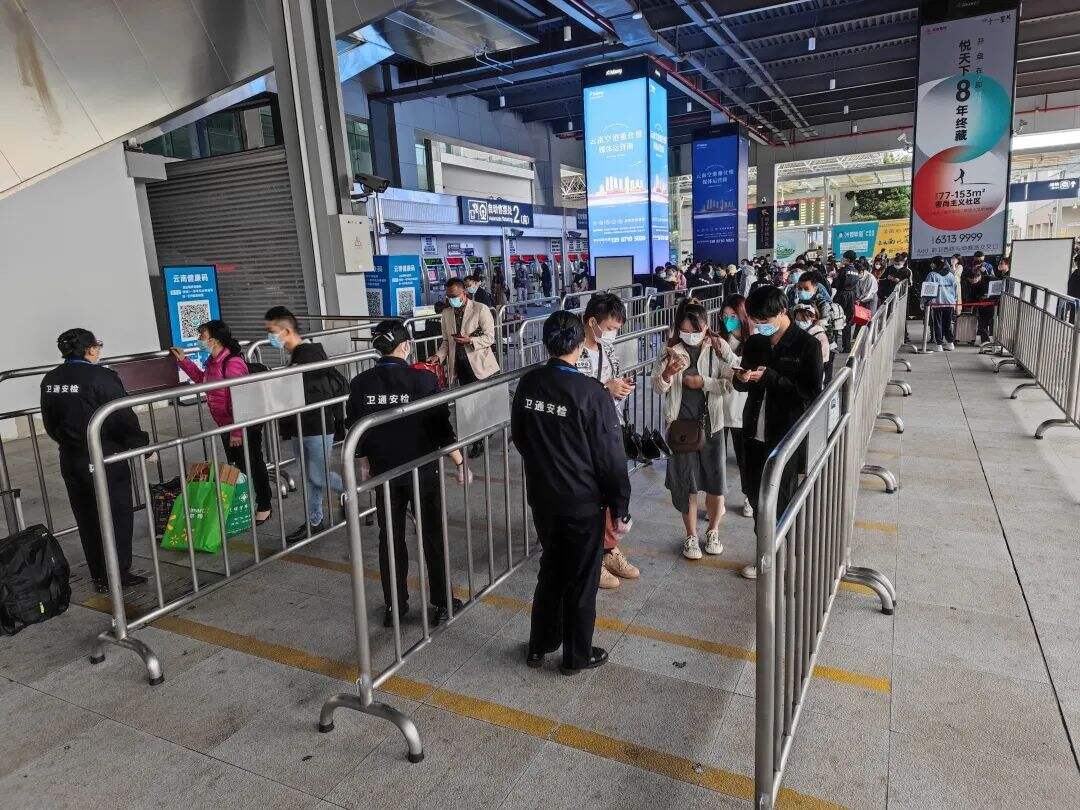 昆明站积极落实疫情防控要求,提前部署、精心组织,在南北广场开启13个“两码”及核酸查验通道,设置指示牌,确保旅客安全有序进站。
