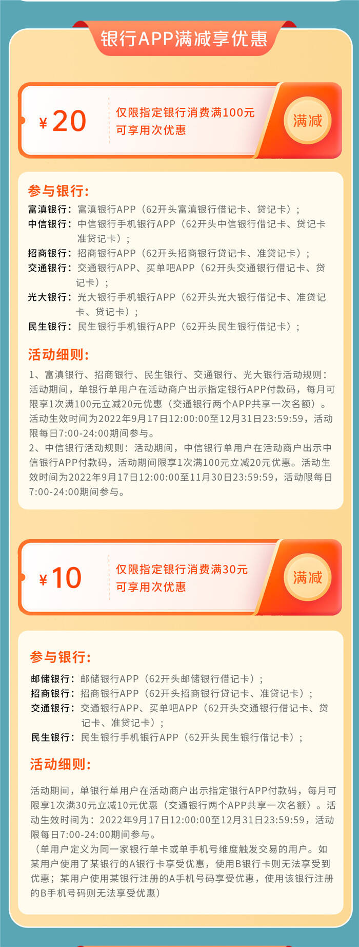 ①通用券(用户三选一,在百货、商场、超市、连锁便利、轻餐、饮品、3C数码、家居家电类、文化娱乐、酒店、景区类指定商户使用)