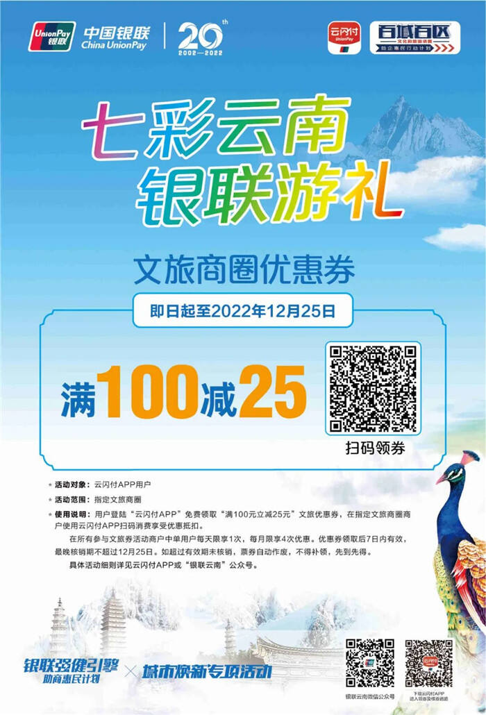 用户登陆“云闪付APP”免费领取“满100元立减25元”文旅优惠券,在指定文旅商圈商户使用云闪付APP扫码消费享受优惠抵扣。