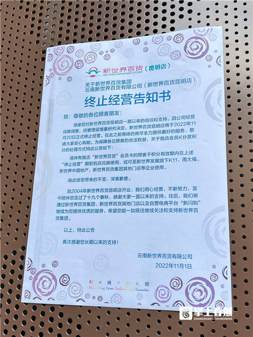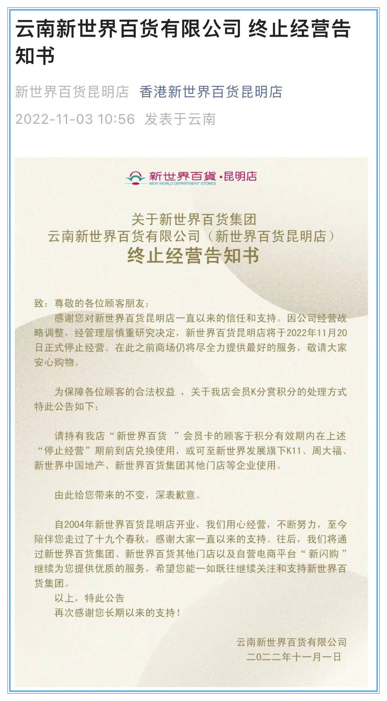 根据《关于新世界百货集团 云南新世界百货有限公司 (新世界百货昆明店) 终止经营告知书》显示:因公司经营战略调整,经管理层慎重研究决定,新世界百货昆明店将于2022年11月20日正式停止经营。在此之前商场仍将尽全力提供最好的服务,敬请大家安心购物。