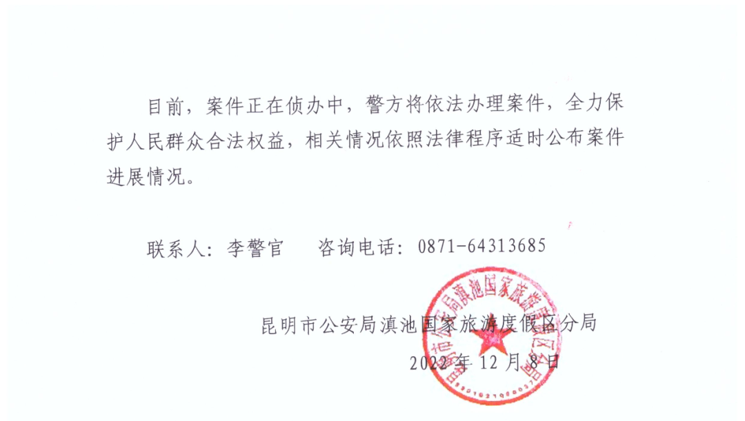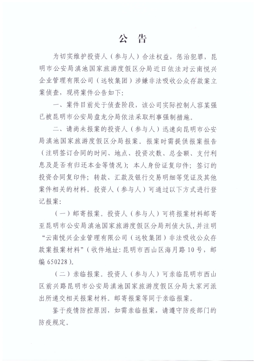 掌上春城讯 12月8日,昆明市公安局滇池国家旅游度假区分局发布公告,云南悦兴企业管理有限公司(远牧集团)涉嫌非法吸收公众存款,请尚未报案的投资人(参与人)迅速向警方报案。详情如下↓