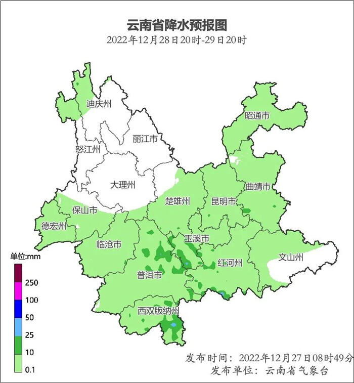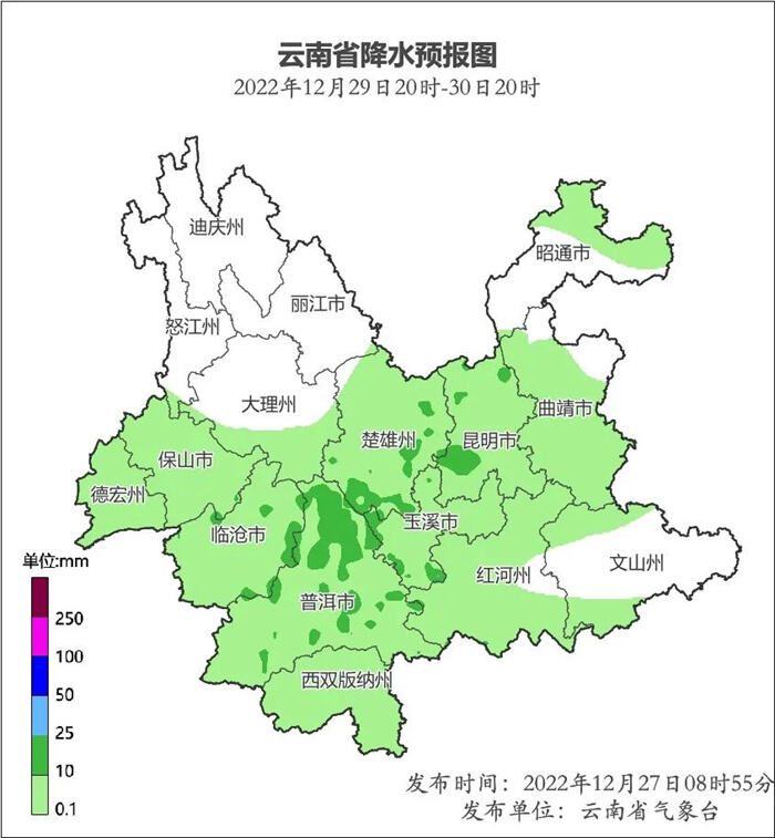 今天迪庆有阵雪,昭通和曲靖北部的高海拔地区有小到中雪,曲靖南部、昆明东部、文山、红河、怒江、保山北部、德宏北部、大理西部有小到中雨局部大雨。