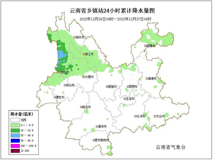 昭通北部高海拔地区阴有雨夹雪或小雪,迪庆、怒江、丽江、大理多云,其它地区阴天间多云有小雨局部中雨。