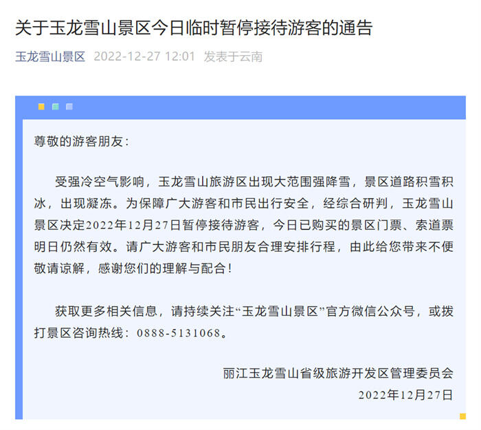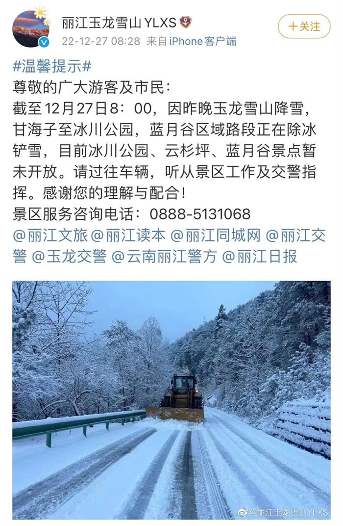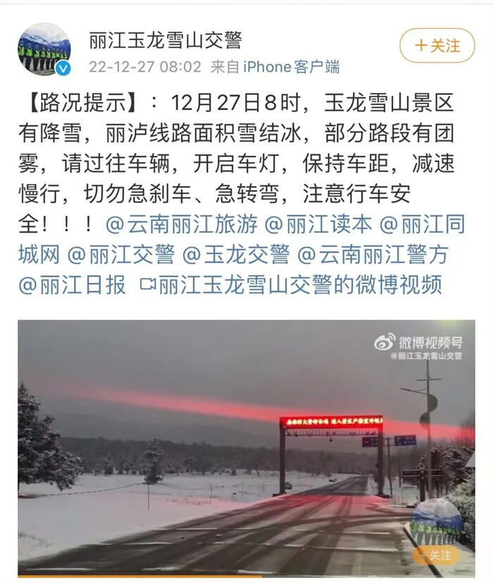 12月27日8时,玉龙雪山景区有降雪,丽泸线路面积雪结冰,部分路段有团雾,请过往车辆,开启车灯,保持车距,减速慢行,切勿急刹车、急转弯,注意行车安全!