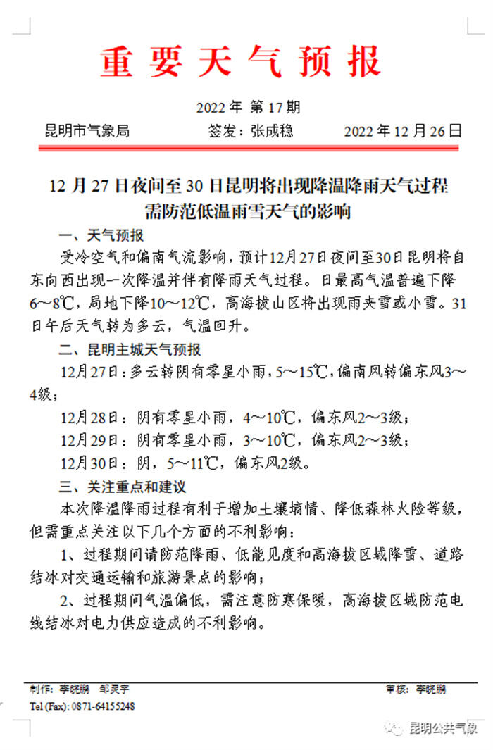 受冷空气和偏南气流影响,预计12月27日夜间至30日,昆明将自东向西出现一次降温并伴有降雨天气过程。日最高气温普遍下降6~8℃,局地下降10~12℃,高海拔山区将出现雨夹雪或小雪。31日午后天气转为多云,气温回升。