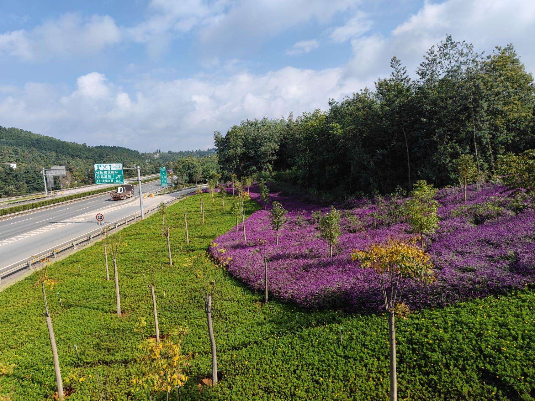 与昆玉高速公路相似,今年昆明元朔建设发展有限公司也积极开展了昆明南连接线高速公绿化美化工作,目前,已完成南连接线高速公路全线绿化提升改造工作。本次绿化提升改造从高峣互通立交至洛羊收费站,全线长约25公里,重点打造道路两侧景观,增加叶色树种一级开花地被,也适当增加不同颜色的秋色叶树,形成彩段式的特色景观大道。