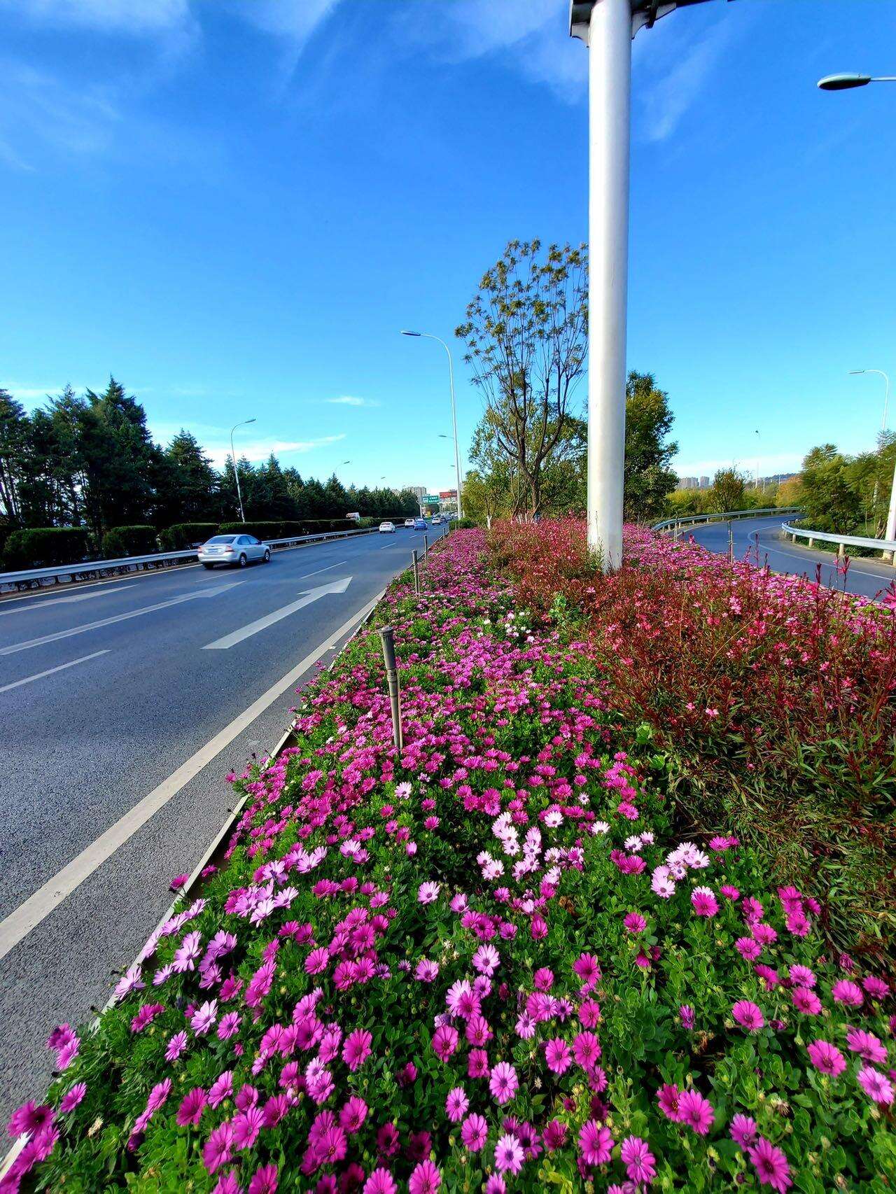 冬日暖阳,驱车行驶在昆玉高速公路鸣泉至马金铺段上,道路宽敞整洁,路旁花开正盛,得到许多驾乘人员的点赞。
