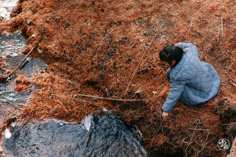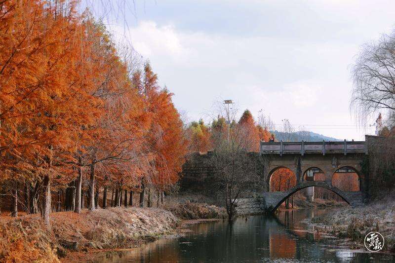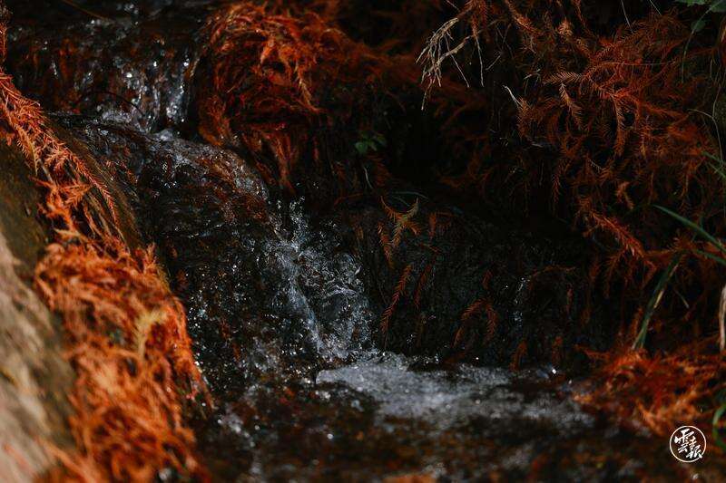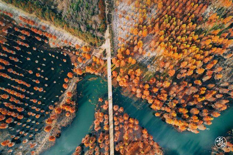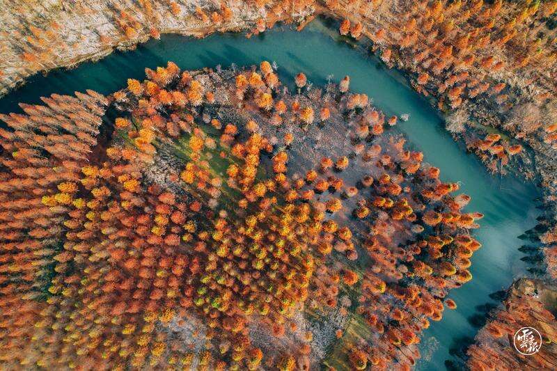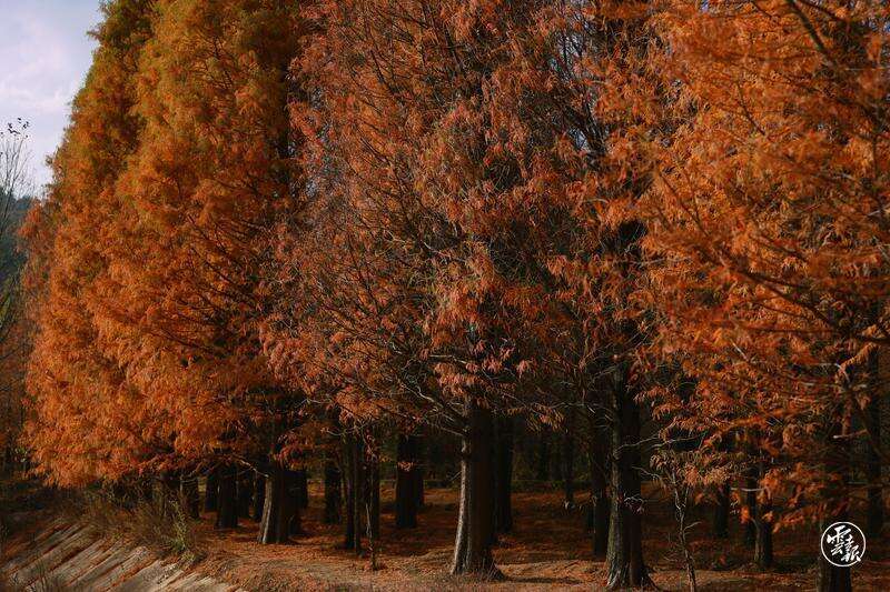 晴朗的天气里,河流如碧绿的玉带一般缠绕着错落有致的红色水杉林,美景连绵不断,宛如撞色的油画。林下溪水潺潺,洗刷着掉落的水杉叶,人在林中游,也完美地与水杉融为画的一景。