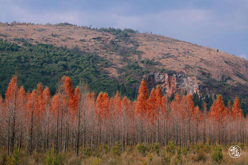 深冬时节,昆明市盘龙区清源街道甸尾村湿地内的水杉林尽裹红装,炙热如火、美如仙境。