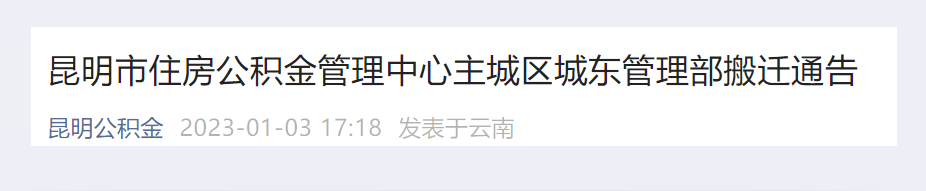 1月3日,昆明市住房公积金管理中心发布主城区城东管理部搬迁通告,详情如下: