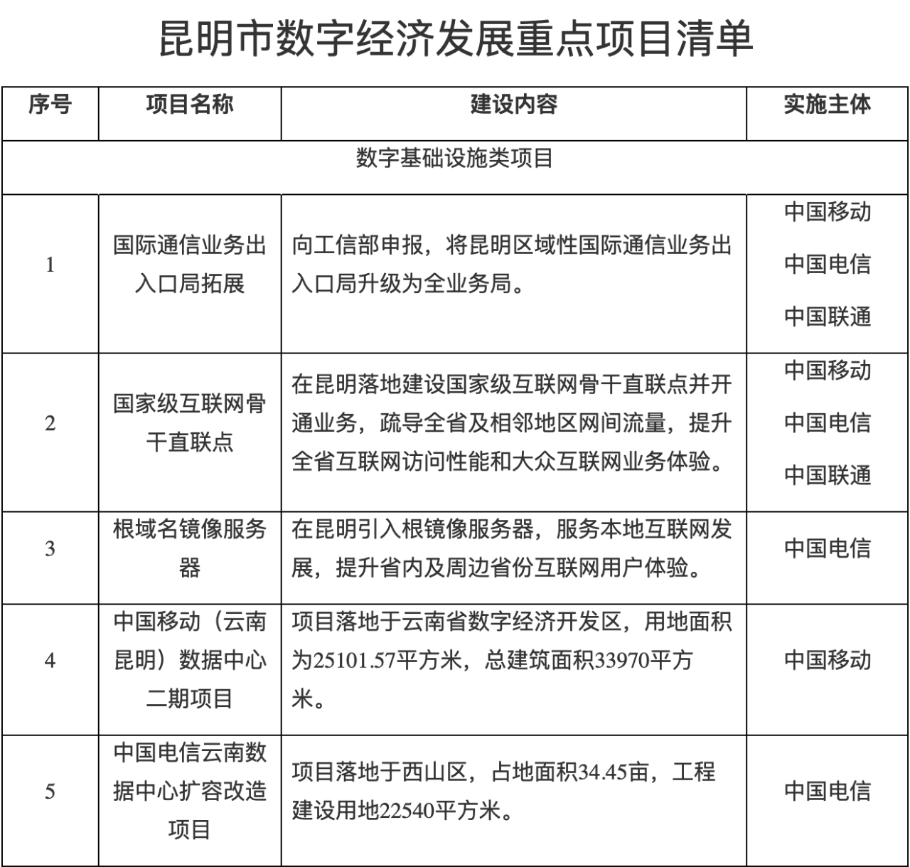 《行动计划》包括打造数字经济发展体系、实施数字经济示范工程、建设数字经济核心载体等方面内容。在基础设施方面,推动昆明千兆网络建设,持续开展老旧小区、工业园区等网络设施改造升级,促进全光网进一步向用户端延伸。推进5G网络在交通枢纽、大型体育场馆、景点等流量密集区域的深度覆盖,有序开展乡镇级以上区域和重点行政村的室外覆盖。到2024年,全市每万人拥有5G基站50个,城市家庭千兆光纤网络覆盖率达到90%以上。