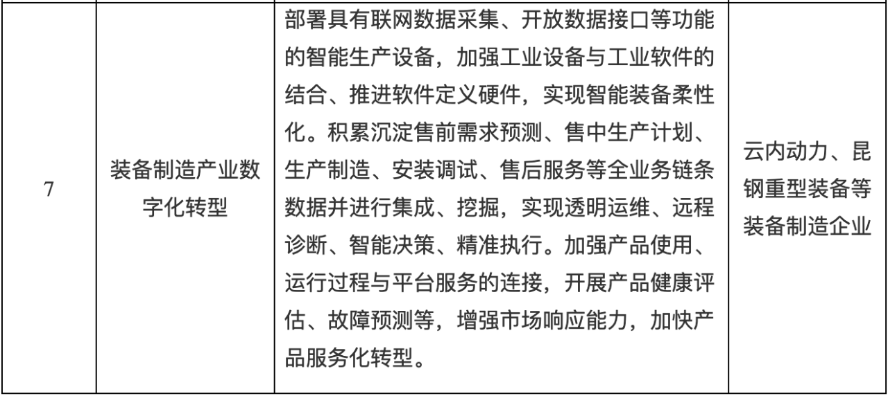 根据《行动计划》,全市将实施智能终端产业园建设、“上云用数赋智”、产业数字化转型、智慧城市建设、智能网联汽车应用、人工智能产业创新、数据治理与流通七大示范工程。具体来看,将以闻泰科技等链主企业为核心,谋划引进一批数字经济产业链上下游企业和项目;开展两化融合贯标,建设昆明市工业互联网公共服务平台,推动工业互联网应用;构建城市大脑,打造城市智能运营中心,推动智慧城市建设;建设智能计算中心,打造一批人工智能创新平台;加强数据治理,推动数据集聚与开放,加快培育数据要素市场。