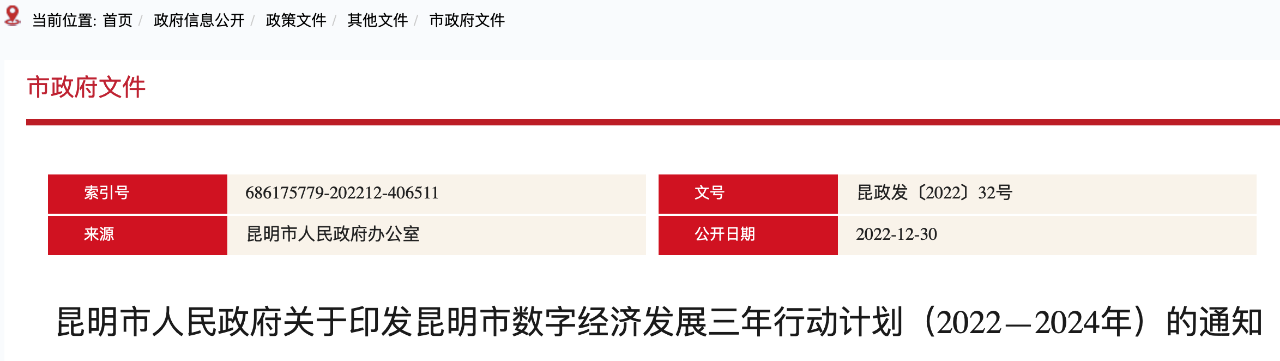 12月30日,市政府官网发布《昆明市数字经济发展三年行动计划(2022—2024年)》(以下简称《行动计划》)及政策解读,提出未来几年数字经济产业发展的目标、措施,加快推动数字经济核心产业链条化、集群化、高端化发展。《行动计划》明确,到2024年,全市数字经济规模翻一番,突破5000亿元,年均增长25%以上,数字经济核心产业增加值占GDP比重超过10%。