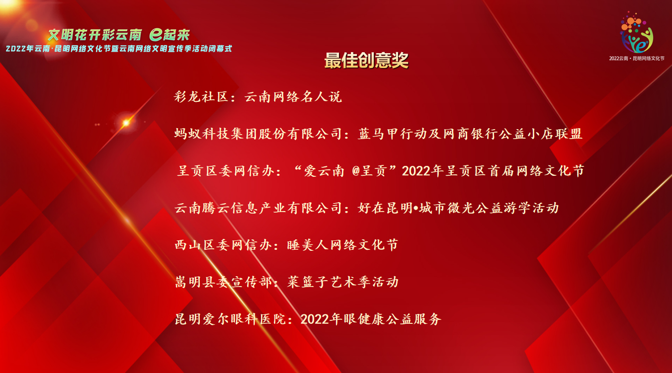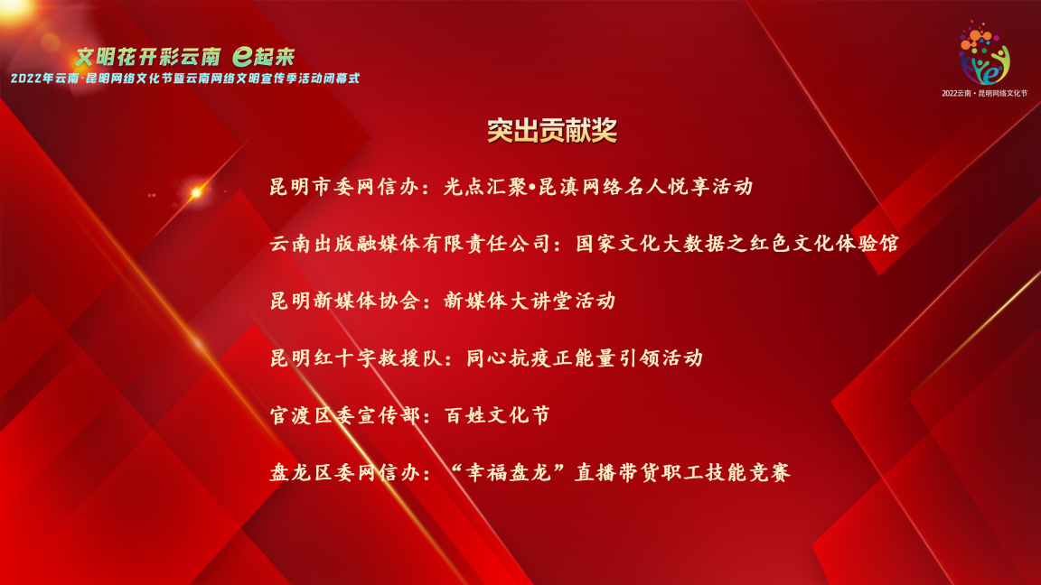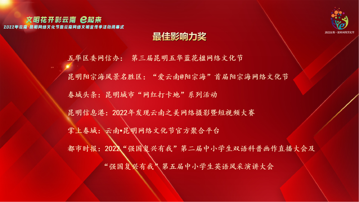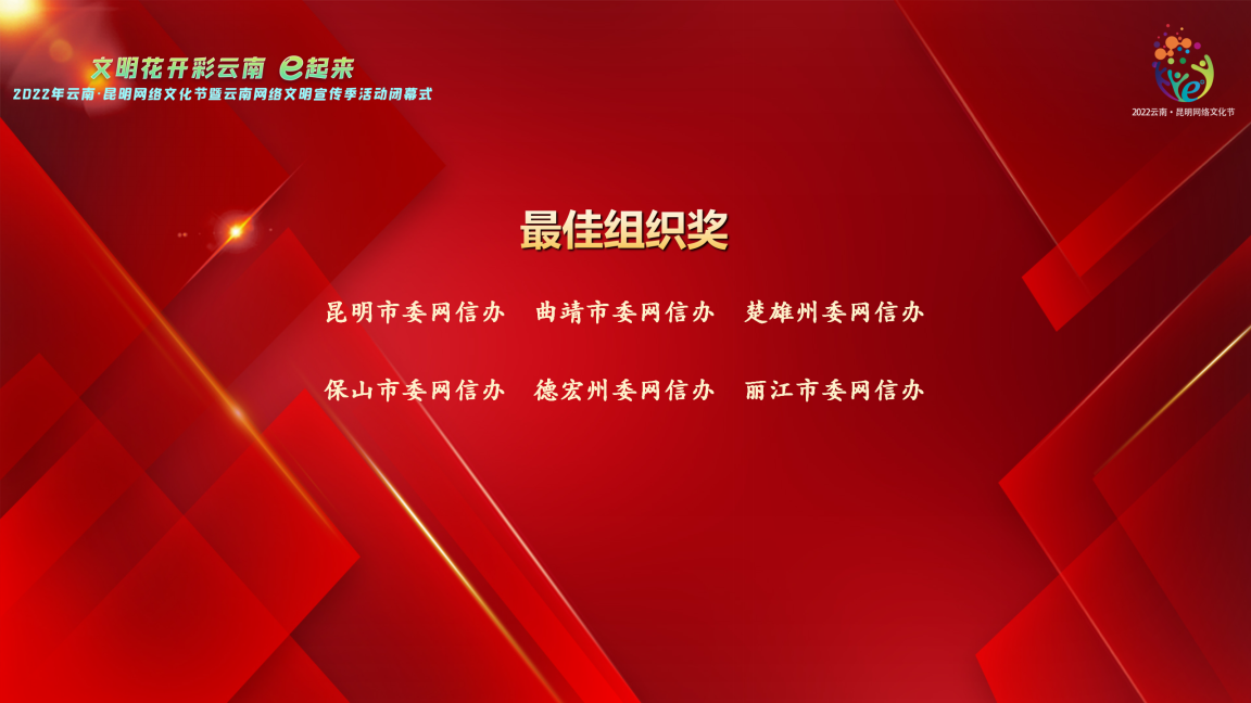 闭幕式通过“党建引领促发展 凝心聚力谱新篇”“弘扬网络正能量·共绘网络文明美好画卷”“汇聚向上向善网络文化新动能”3个篇章回顾了活动亮点特色。同时,还揭晓了2022年云南·昆明网络文化节暨云南网络文明宣传季活动最佳组织奖、最佳影响力奖、最佳创意奖、突出贡献奖四大奖项。