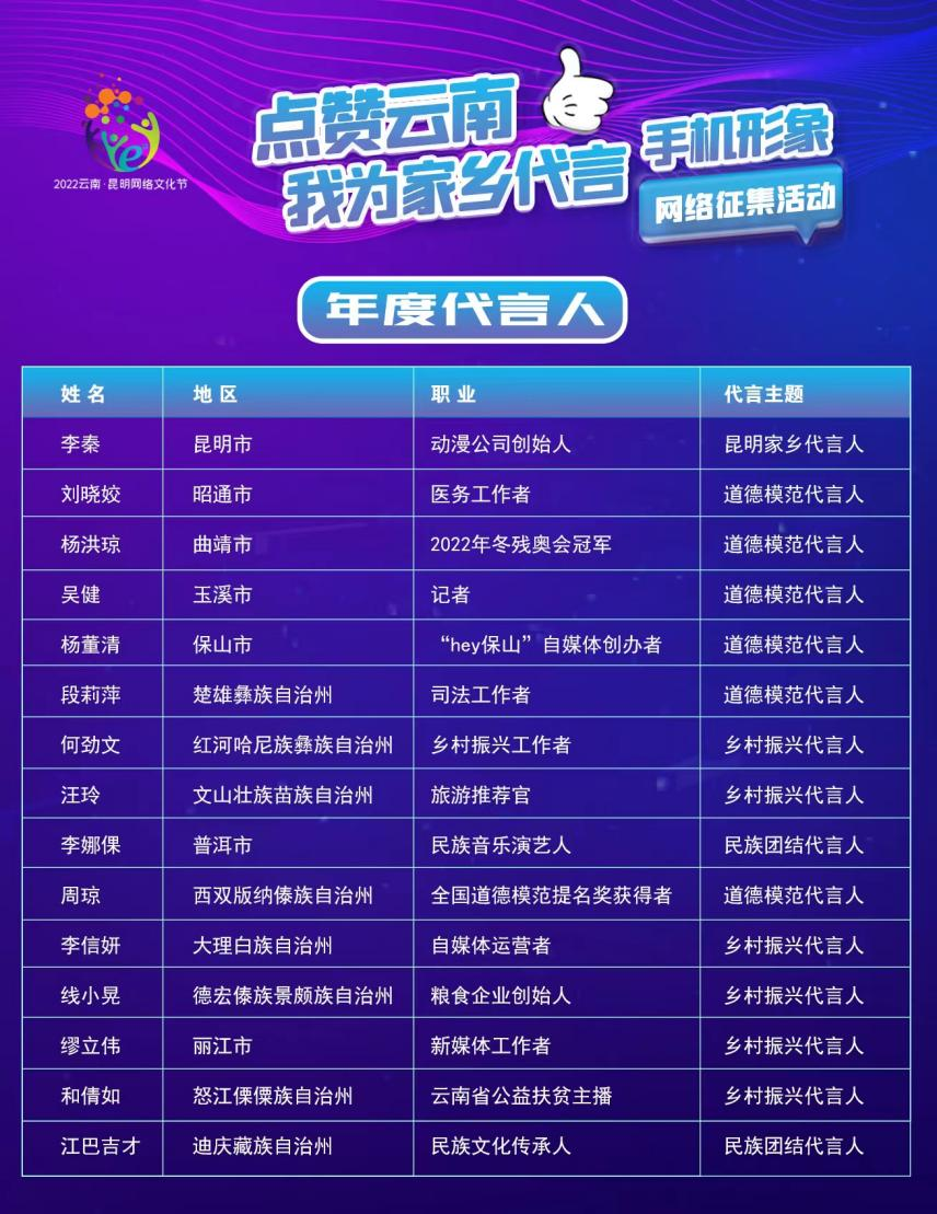 “点赞云南·我为家乡代言”年度代言人名单