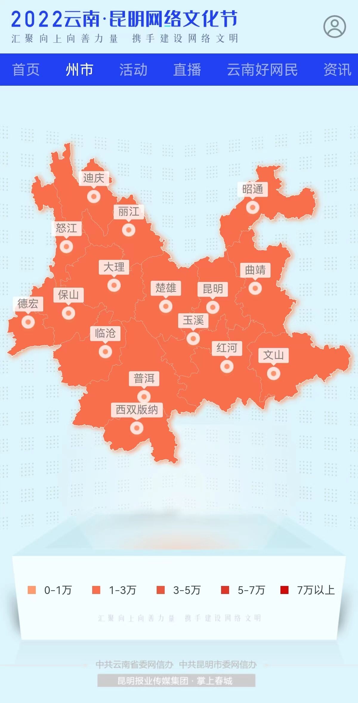 2022云南·昆明网络文化节创新搭建活动主平台,以一屏融合活动资源、征集通道、直播云南、媒体直达,实现省级和16州市活动的全展示、全聚合。平台展示省级活动超30个,浏览量超340万。在抖音、快手和微博等新媒体平台发稿1659篇。