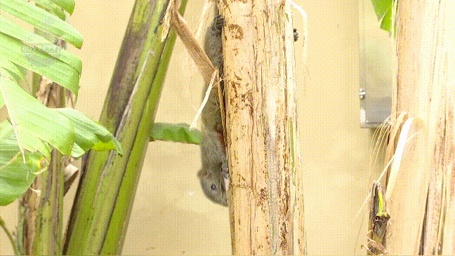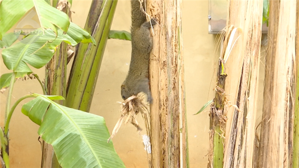 除了这只落落大方享用美食的松鼠,记者在翠湖公园内也看到了和游客近距离互动的小可爱。这只小松鼠抱着芭蕉树干来回跑动,不一会找准位置的它开始用嘴收集树皮。