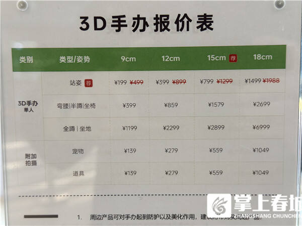 记者了解到,手办的材质是全彩树脂,在打印过程中将颜色溶进材料,从而使手办颜色更具色彩和丰富。“我们的价格和手办的尺寸有关,目前有4个尺寸,9CM售价199元/人,12CM售价399元/人,15CM售价799元/人,18CM售价1499元/人。”陈洲介绍道。