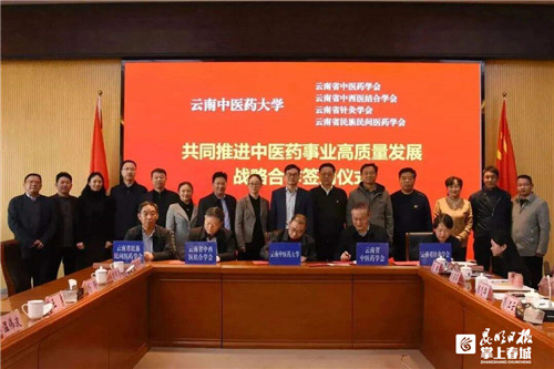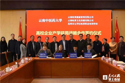 座谈会上,学校与云南省中医药界学会联合体签署共同推进中医药事业高质量发展战略合作协议,与校友开办企业云南岐黄文化传播有限公司、云南岐黄健康管理有限公司、昆明市五华区岐黄职业培训学校签订高校企业产学研用战略合作协议。