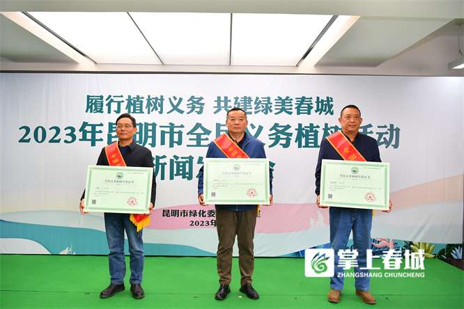发布会现场还对三位“务林人”代表——全国绿化奖章获得者、昆明市呈贡区洛龙街道办事处涉农综合服务中心主任陈忠新,全国绿化先进工作者、昆明市林业和草原局正高级工程师徐学杰,全国绿化先进工作者、昆明市林业和草原科技推广总站站长马骏颁发了全民义务植树尽责证书。