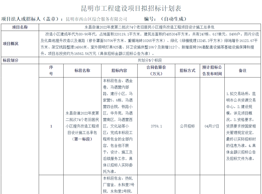 根据云南省公共资源交易信息网发布的永昌街道74个老旧居民小区提升改造工程项目拟招标计划表内容,此次改造小区建成年代为80至90年代,占地面积320119.1平方米,建筑总面积约485304平方米。共有247栋、617单元、8499户。