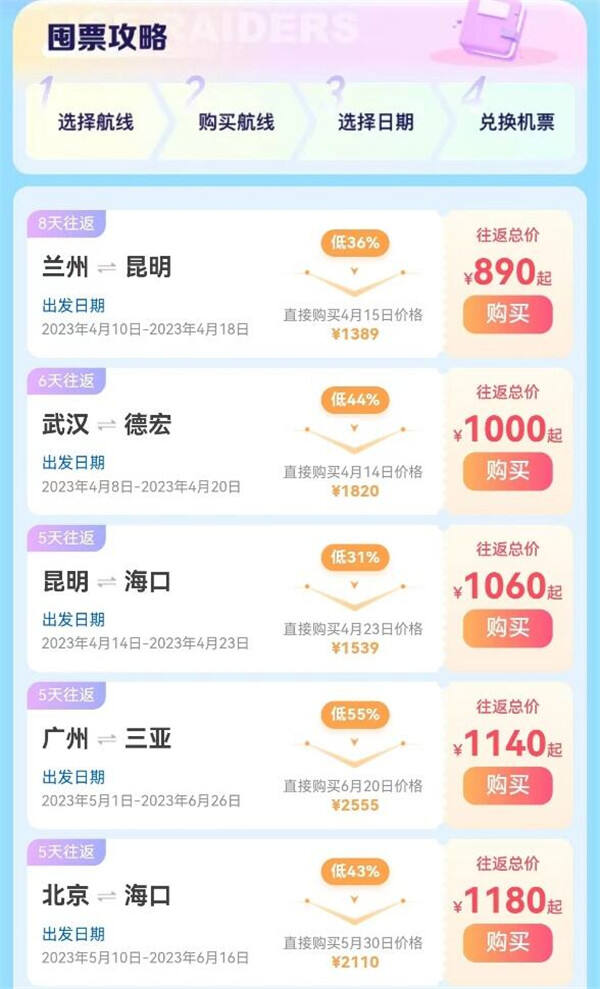 为满足大学生低价出行的需求,去哪儿推出“校园卡”,18-26周岁学生均可免费领取,享受火车最高速购票(1年4次)、无忧退改,飞机快速安检、延误补偿,酒店提前入住、延迟退房等权益。此外,去哪儿也上线了“机票提前囤”项目,提前购入低价预售机票,再选择心仪时间兑换机票,未兑换或过期可退全款。