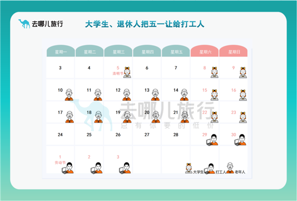 4月3日是老年旅客返程的小高峰,与大学生一样,今年老年旅客也把五一让给了打工人。去哪儿数据显示,截至4月12日,老年旅客五一机票预订量同比2019年下降一成。去哪儿大数据研究院副院长郭乐春表示:“‘最火’五一比价也要旅游的打工人,周末连续打卡30多个景点的大学生,旅客的出游热情带动了需求端的强势恢复,也为旅游从业者提出挑战。我们也看到,自2023年以来,旅游利好消息频出,交通方面,航班量有序恢复,新开了多城市直达香港的高铁;目的地方面,各地提供半价景区门票,淄博甚至加开了烧烤专列;去哪儿也提供了低价预售票和五一优惠券包……更多从业者真正从旅客需求出发,提供丰富的特色旅游产品,给旅客更好的旅游体验。”