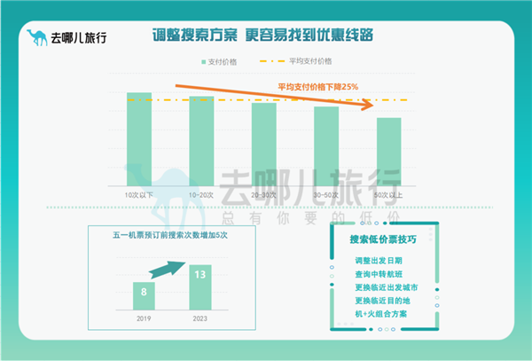 去哪儿数据显示,截至4月12日,“80后”“90后”的五一机票预订量同比2022年增长5倍,为各年龄段增长最高。节假日前,用户预订前平均搜索量为13次,较2019年平均增加5次。通过调整搜索方案,更容易淘到低价票。搜索比价50次以上的用户比搜索10次以下的用户,淘到低价票的概率更高,平均支付价格低四分之一。