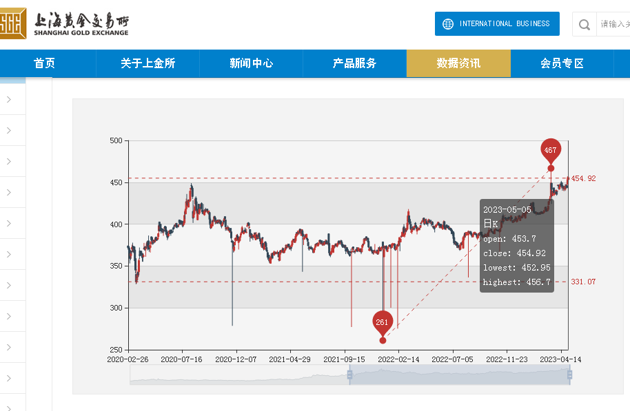 2020年8月7日,黄金Au99.99期货收盘价达446元/克,创历史新高,之后一直在350元/克至410元/克之间运行。2023年3月黄金价格持续上涨,上海黄金交易所交易数据显示,5月8日Au99.99黄金收盘价已达453元/克,刷新历史记录。
