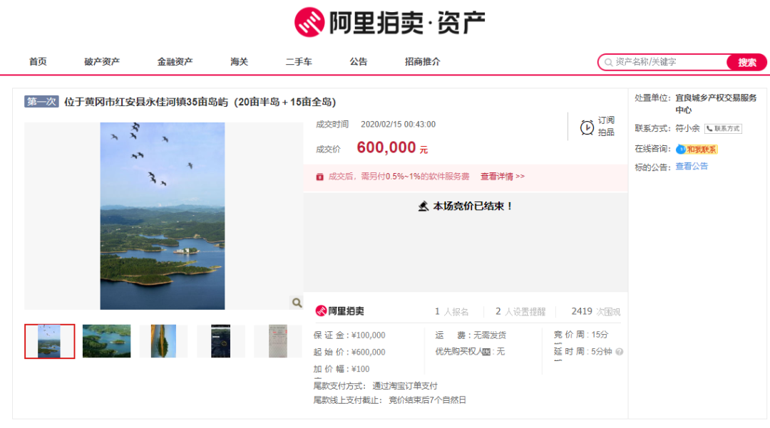仅隔五天,又有位于黄冈麻城市的267亩岛屿拍卖,以125万成交。