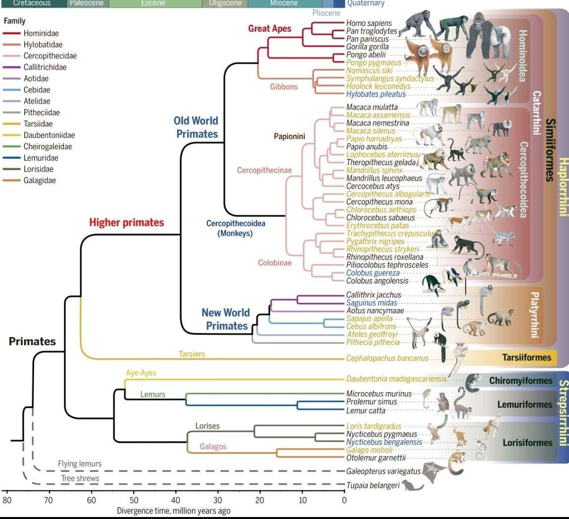 “英国有‘达尔文生命之树项目’,美国有‘哺乳动物基因组项目’,从国家战略角度来看,收集物种基因组资源具有重要意义。”灵长类基因组计划另一位发起人、浙江大学生命演化研究中心教授张国捷坦言,“这就像谁先产生了大量数据,谁就拥有了一个‘矿藏’,也就有了挖掘这些数据的优先权和主导权。” 已有研究显示,灵长目是哺乳动物中种类最丰富的类群之一,包括16科82属520余种,仅次于翼手目和啮齿目,目前依然有新物种不断被发现。 科学家为什么要研究灵长类动物?吴东东解释,灵长类的演化经历了6500多万年,从独居的夜行性祖先到今天高度发达的人类社会,发生了诸多变化。此外,部分灵长类也是研究人类起源和演化、疾病发生机理、烈性传染病传播和疫苗研发的天然动物模型。 “由于人类活动的影响,灵长类物种的丰富度和群体数量正遭受前所未有的严峻挑战,而目前覆盖绝大多数灵长类动物支系的比较基因组学研究仍然存在相当大的缺口。”吴东东表示,这些研究有望揭示人类特异表型变异和灵长类谱系间多样性阶梯式改变的演化规律,尤其是那些位于灵长类系统发育树基部的类群缺乏系统性的比较研究。