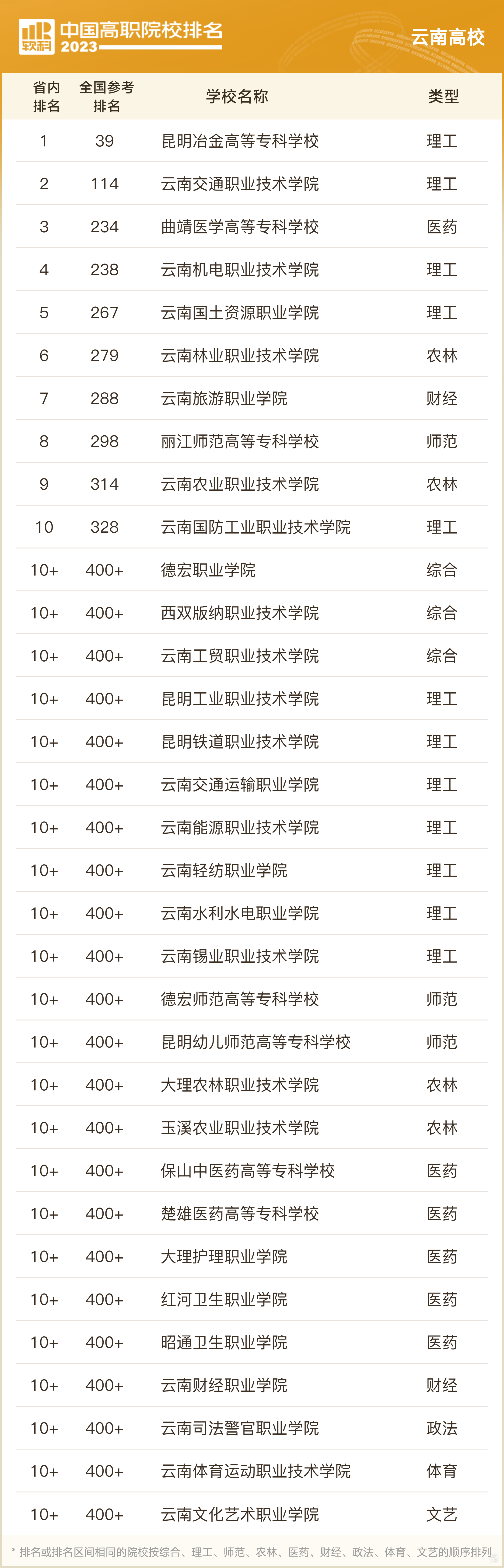 “2023软科中国高职院校排名”的对象是我国1000余所专科层次的院校。为充分反映院校在学校性质和学校类型上的差异,确保排名结果的公平性和可比性,软科基于学校自身定位和学生分布,将高职院校分为10类,采用差异化的指标体系分别排名。其中公办院校分为综合类、理工类、师范类、农林类、医药类、财经类、政法类、体育类、文艺类9个类型,对于民办院校则作为一个类型单独排名。
