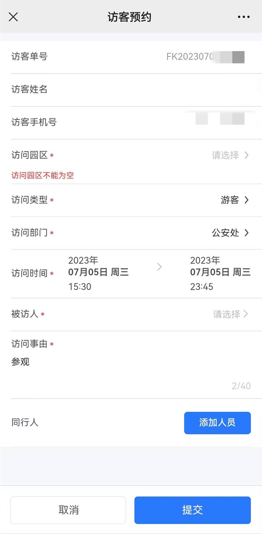 ⑤在访客预约页面填写信息,之后点击提交即可完成预约。