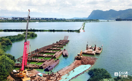 掌上春城讯 作为东风坝整治修复工程重点项目之一的“七孔浮桥”,自7月初开始架设以来,工程进展顺利,已完成一半任务量,将按计划全力推进工程建设。