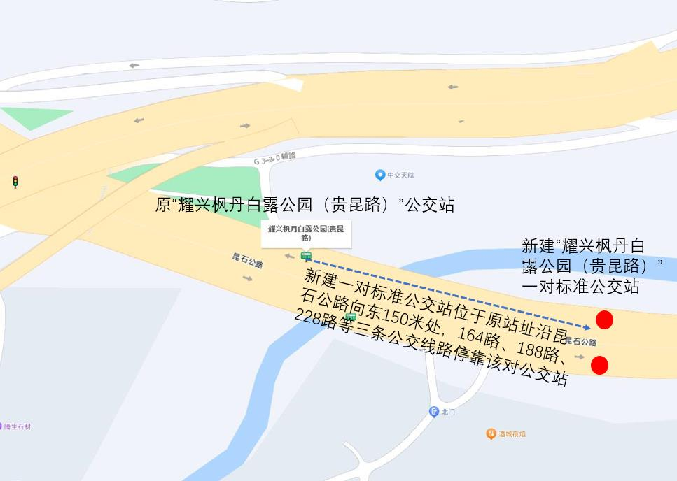 原耀兴枫丹白露公园(贵昆路)公交站位于昆石公路与G320辅路交叉口附近,新建的耀兴枫丹白露公园(贵昆路)标准公交站距离原公交站向东150米处。164路、188路、228路这三条公交线路停靠该新建标准公交站。