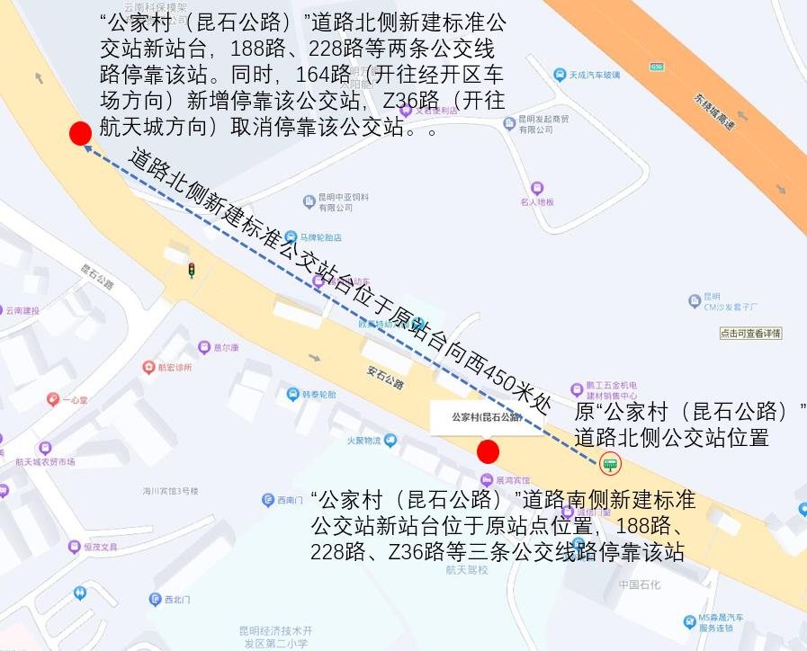 公家村(昆石公路)道路北侧新建标准公交站,位于原站点位置向西450米处。188路、228路这两条公交线路停靠该站。同时,164路(开往经开区车场方向)新增停靠该公交站,Z36路(开往航天城方向)取消停靠该公交站。