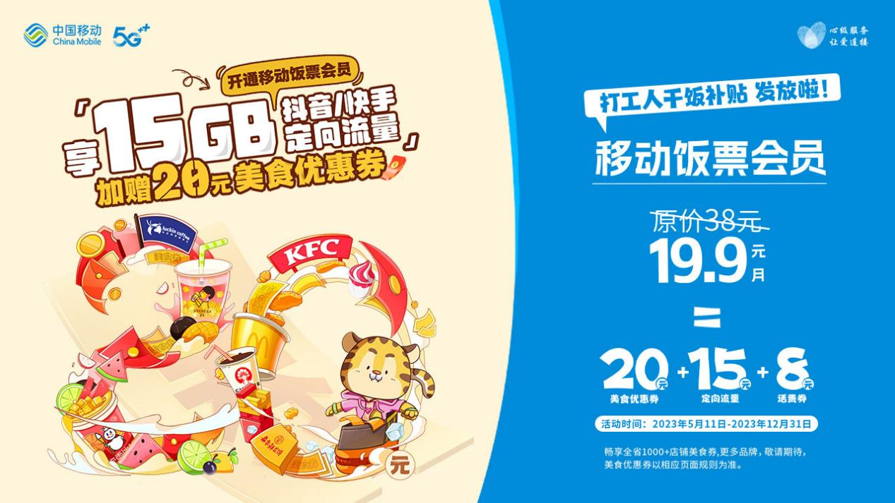 除了美食优惠券和定向流量,还有福利放送!现在来云南移动开通移动“饭票会员”,每月只需19.9元就可享受到20元美食优惠券、15GB定向流量和8元话费券,云南移动带你体验“买到就是赚到”的快乐。