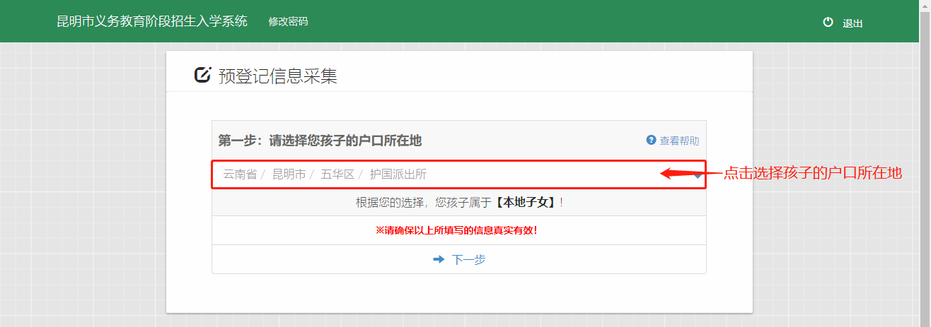 根据系统要求逐级选择孩子的户口所在地,系统会根据所选户口判定属于“本地子女”或“随迁子女”,确认无误后点击 下一步。如下图: