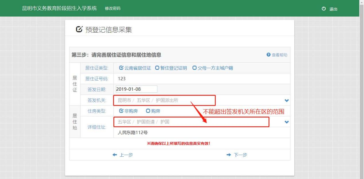 注意:居住地所属县区和居住证(或主城户籍)签发机关所属县区应该一致。(如:居住证签发机关或父母一方户口所属五华区,那么在选择居住地片区时就只能选择五华区辖区内的街道和社区)。