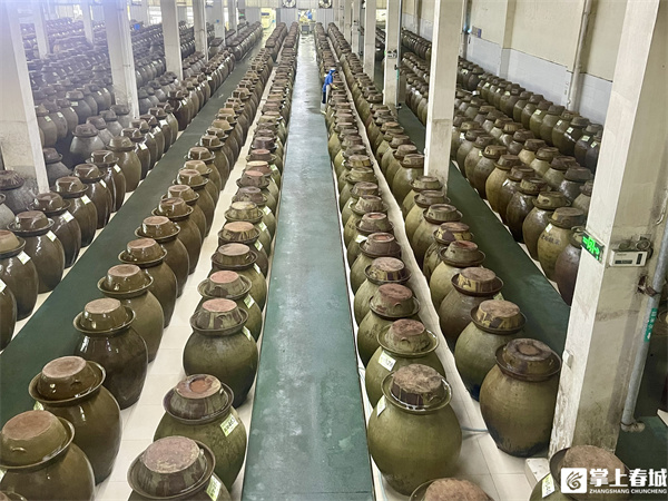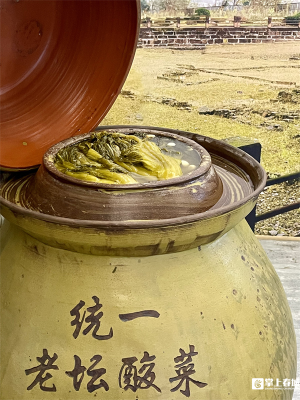 在企业生产车间,采访团了解了老坛酸菜制作的完整流程:新鲜芥菜要通过采摘、晾晒、检测等工序后,才能进入发酵池进行发酵。在九九八十一天的一次发酵后,再进行挑选分切后经过四道机洗、三道人工清洗后再进入传统老陶坛进行7天左右的二次发酵。在二次发酵车间里,传统老坛整齐排列着,静静酝酿绵长的酸爽。