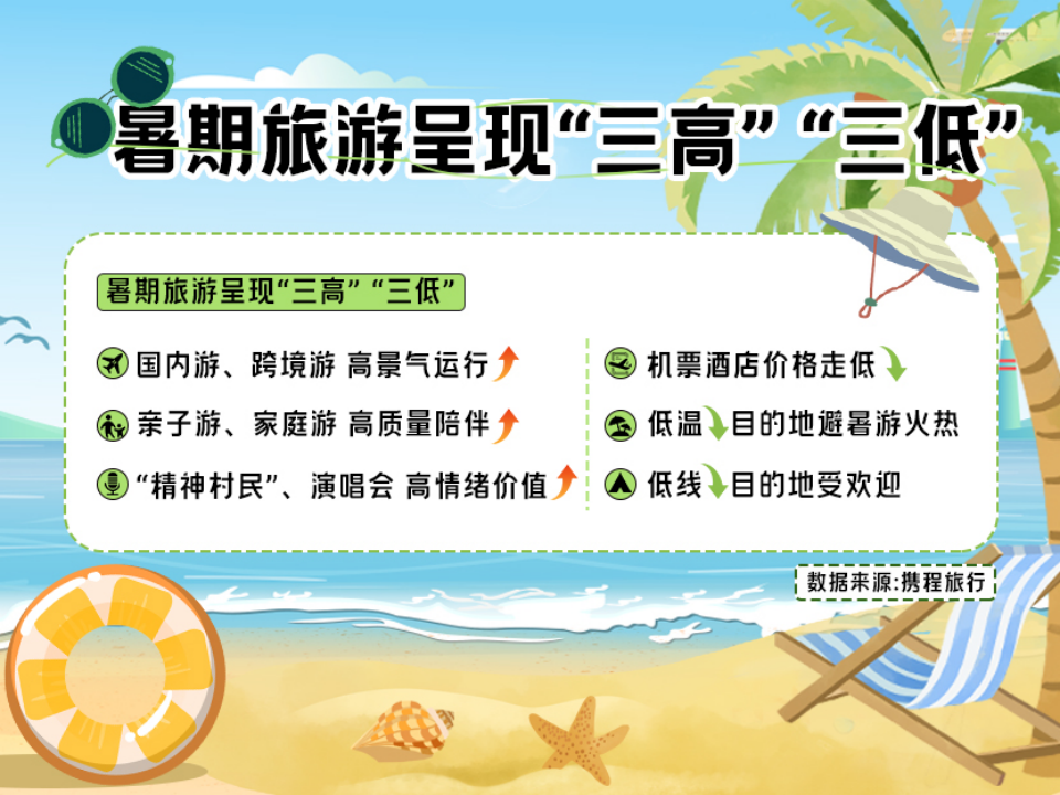 掌上春城讯 8月28日,携程发布的《2024暑期出游市场报告》显示,今年暑假旅游市场继续展现消费韧性,整体呈现“三高三低”特征。“三高”即国内游、跨境游持续保持高景气运行,高质量陪伴的亲子游、家庭游持续火热,“精神村民”、City ride、演唱会等提供高情绪价值的玩法受到年轻人追捧;“三低”即适宜避暑的低温目的地及室内项目火爆,机票酒店因供应恢复呈现价格走低趋势,三四线城市、县域及乡村等低线目的地一路走红。