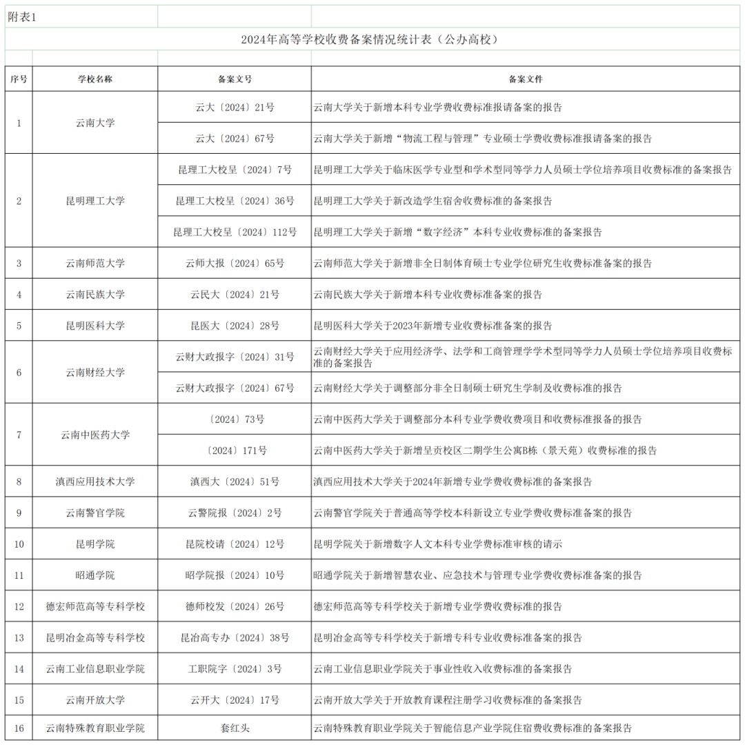 按照《云南省教育厅 云南省发展和改革委员会关于规范高等学校教育收费备案程序有关事项的通知》要求,现将2024年高等学校收费备案情况公告如下: