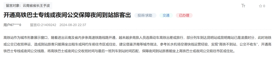 掌上春城讯 近日,有网友建议开通高铁巴士专线或夜间公交保障夜间到站旅客出行,其中提到:部分列车到达昆明站或昆明南站已是凌晨时分,此时地铁或公交已收班停运,造成到站旅客只能乘坐出租车或网约车前往市区或住处,建议借鉴济南等城市做法,参考长水机场空港快线运营经验,实现“高铁不到站,公交不收车”,开通高铁巴士专线或夜间公交线路,将高铁巴士或夜间公交收班时间与最后一班列车到站时间匹配,保障夜间到站旅客能坐上高铁巴士或夜间公交前往市区或住处。