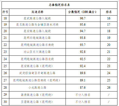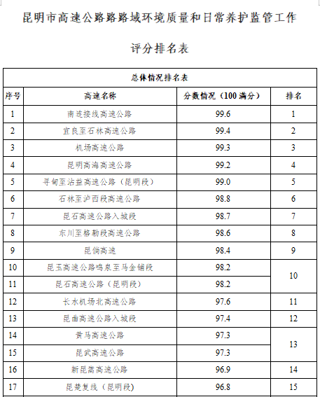 第三季度,昆明市交通运输局按照《昆明市高速公路路域环境综合整治工作方案》《昆明市高速公路路域环境综合整治督查考核办法》《云南省交通运输厅关于印发〈云南省高速有关规定公路日常养护监管“一季度一巡查”评估工作细则〉的通知》有关规定,对市域内30条高速公路开展了路域环境检查测评。根据检查结果,红榜为南连接线高速公路、宜良至石林高速公路、机场高速公路;黑榜为武定经倘甸至寻甸高速公路、昆明绕城高速公路西南段(昆明段)、小龙高速公路。