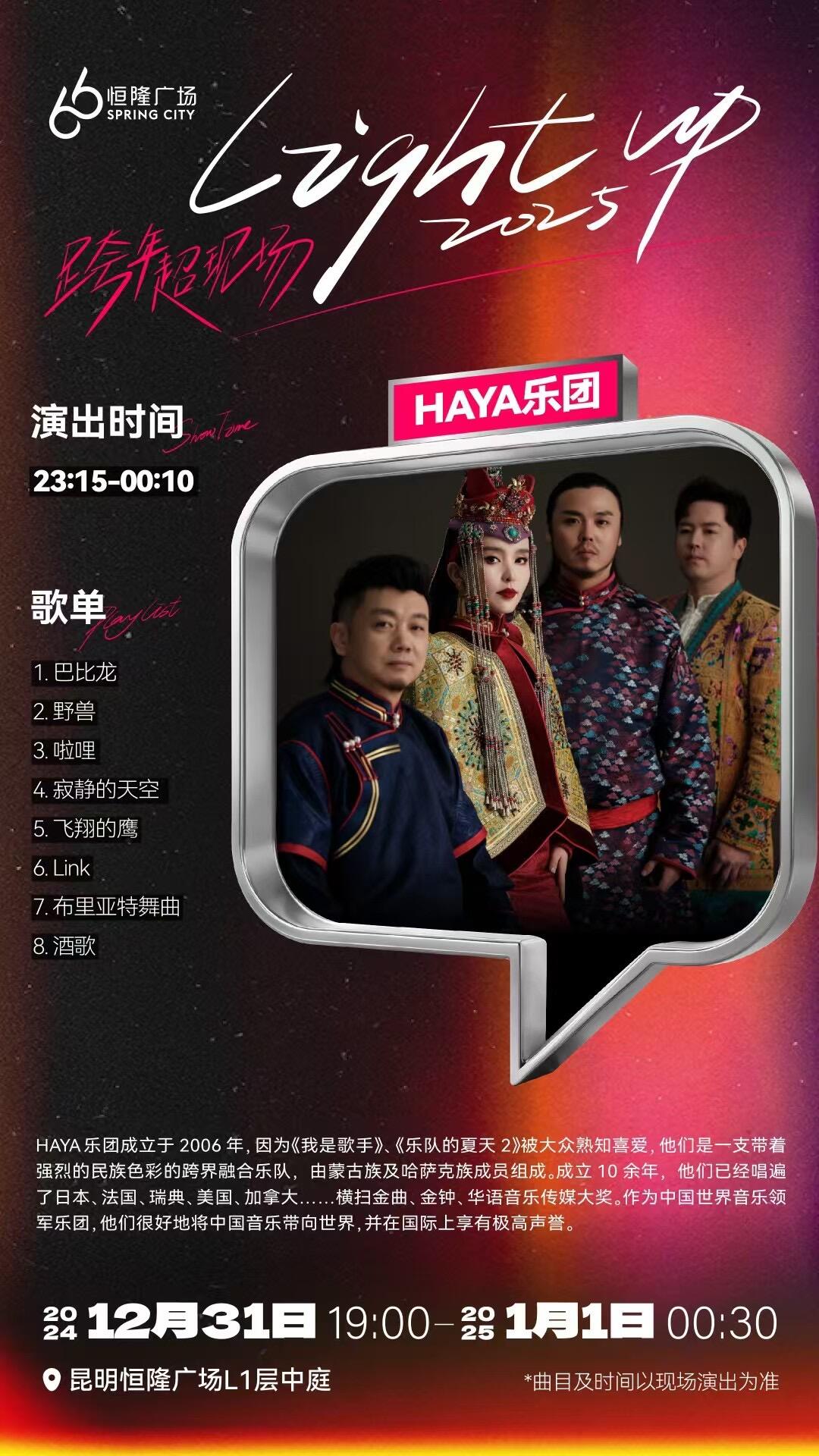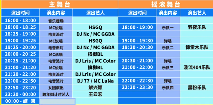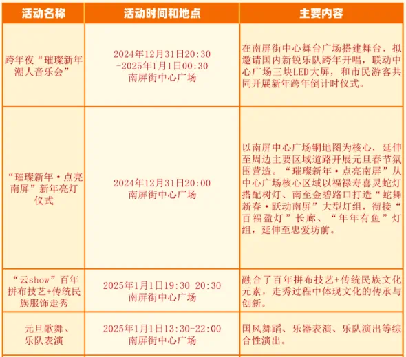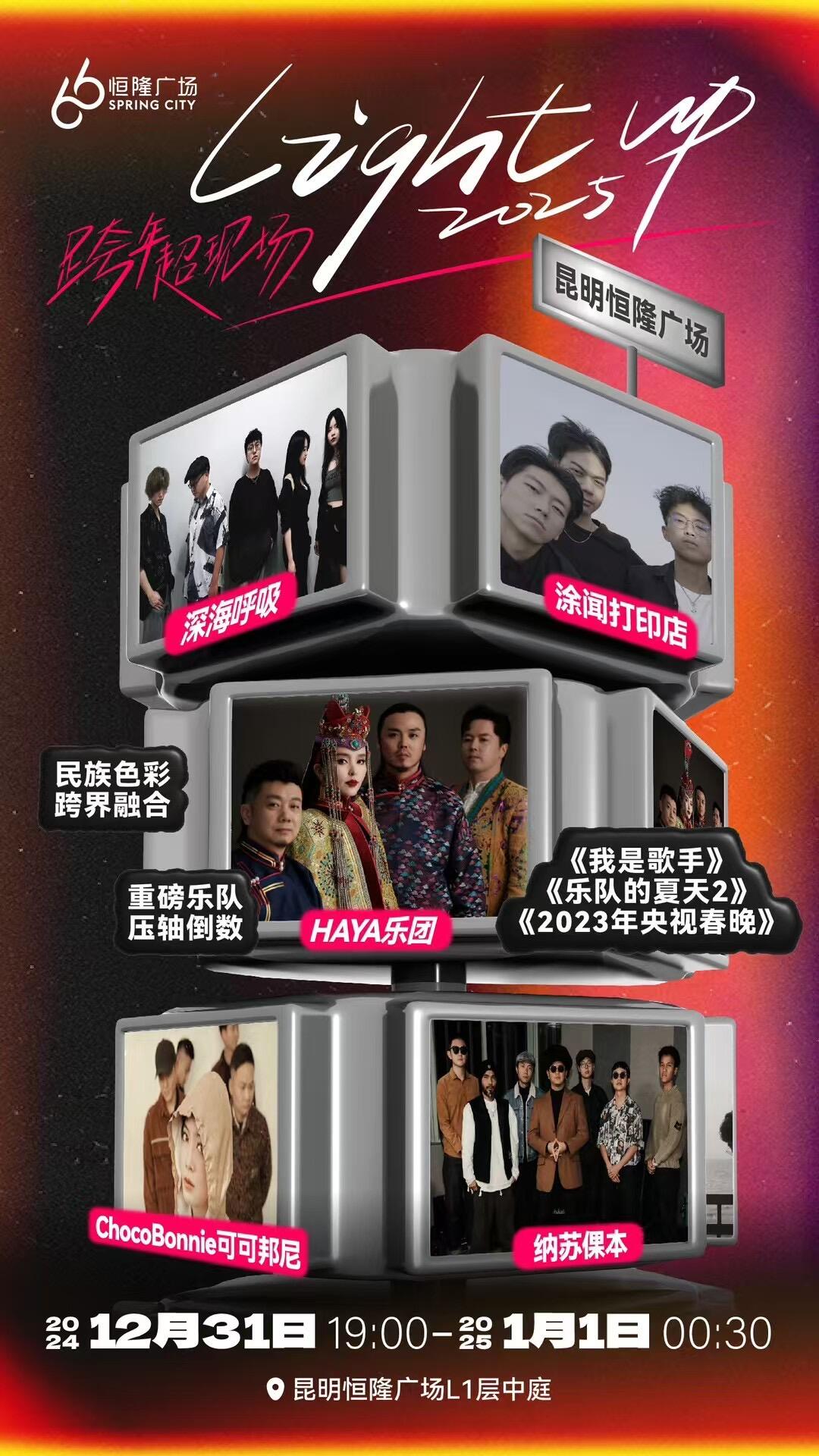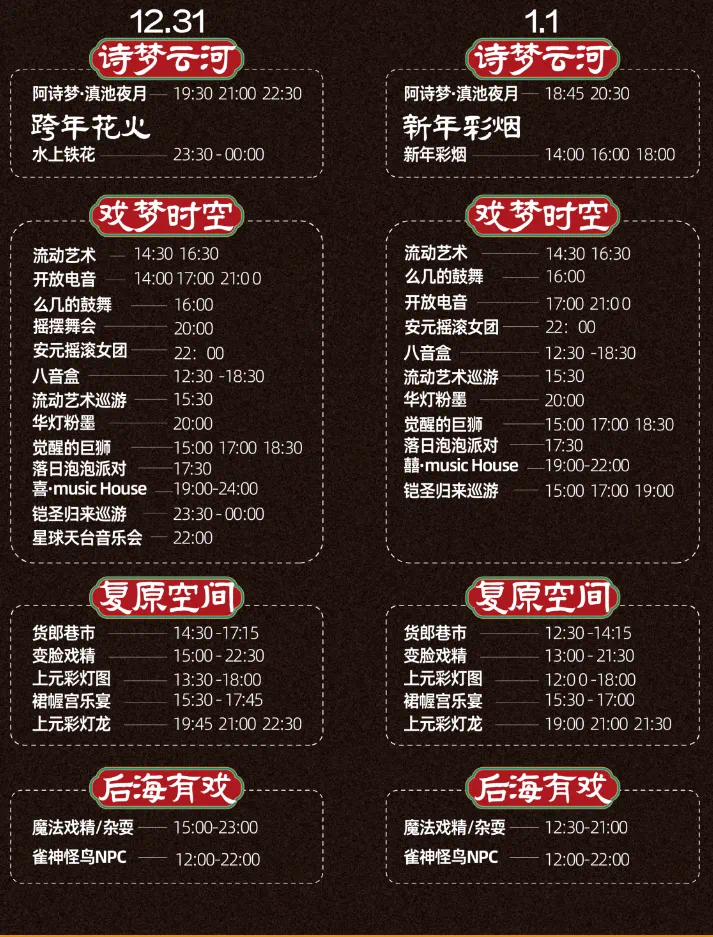 活动内容:光影秀场、跨年烟花秀、跨年音乐节、热情打歌...