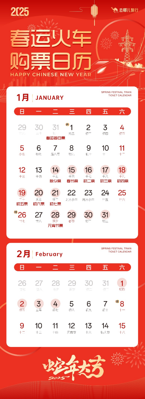 1月25日是春节假期前最后一个休息日,只需要26、27日请2天假,就能拼凑出一个11天超长假期。从去哪儿搜索情况来看,1月25日有望超越除夕、初七,成为春运出行的最高峰。1月25日的火车票将于1月10日放票,除夕票将于1月13日开售,不同线路的车票开售时间不同,去哪儿建议旅客关注车票发售时间。