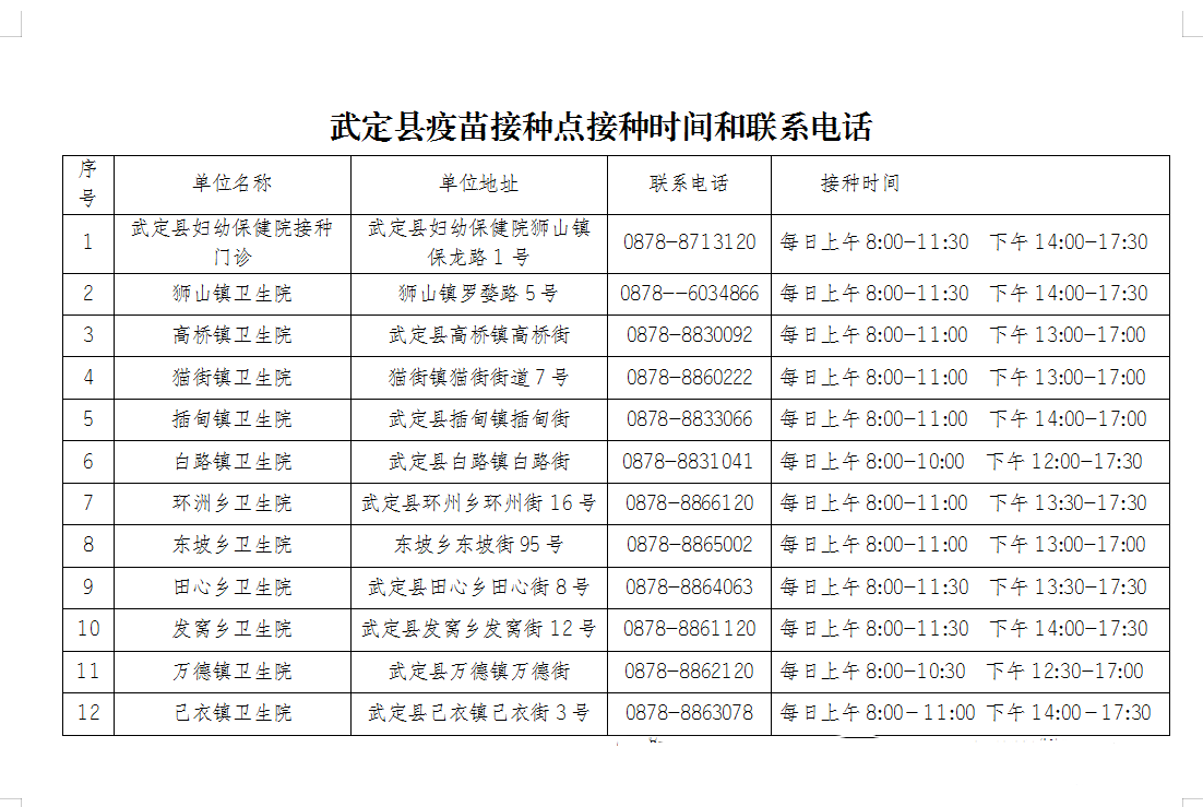 在接种服务方面,有接种需求的适龄女性可前往武定县各疫苗接种点进行预约。特别值得一提的是,狮山镇卫生院、县妇幼保健院无需预约,支持随到随接种,极大地方便了群众。以下为武定县各疫苗接种点的具体接种时间及联系电话,有需要的市民可提前咨询了解。