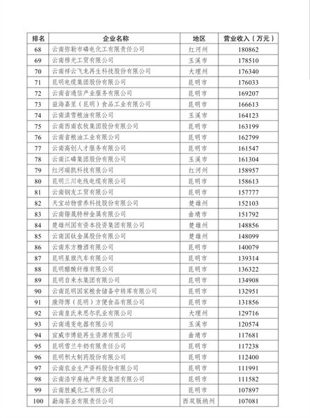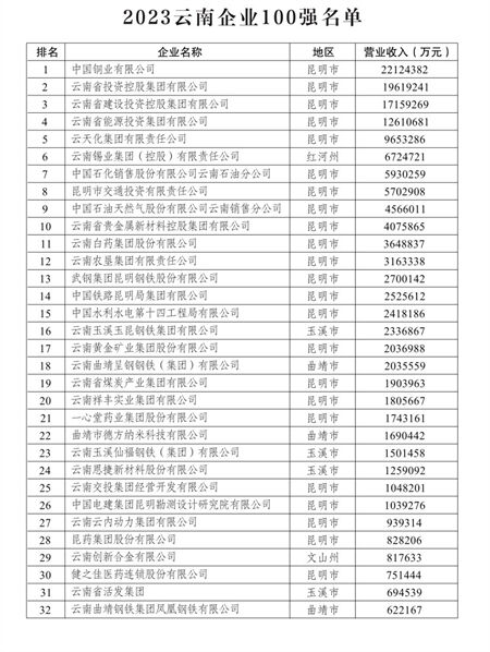 据悉,今年是省企业联合会、省企业家协会第16年发布“云南企业100强名单”,云南省企业联合会参照国际上通用的做法,按照企业自愿参加、自愿申报的原则,以2022年企业营业收入为入围标准,推出2023云南企业100强、云南制造业企业100强、云南服务业企业50强、云南民营企业100强和云南高新技术企业100强、云南企业年度营业收入突破亿元企业。
